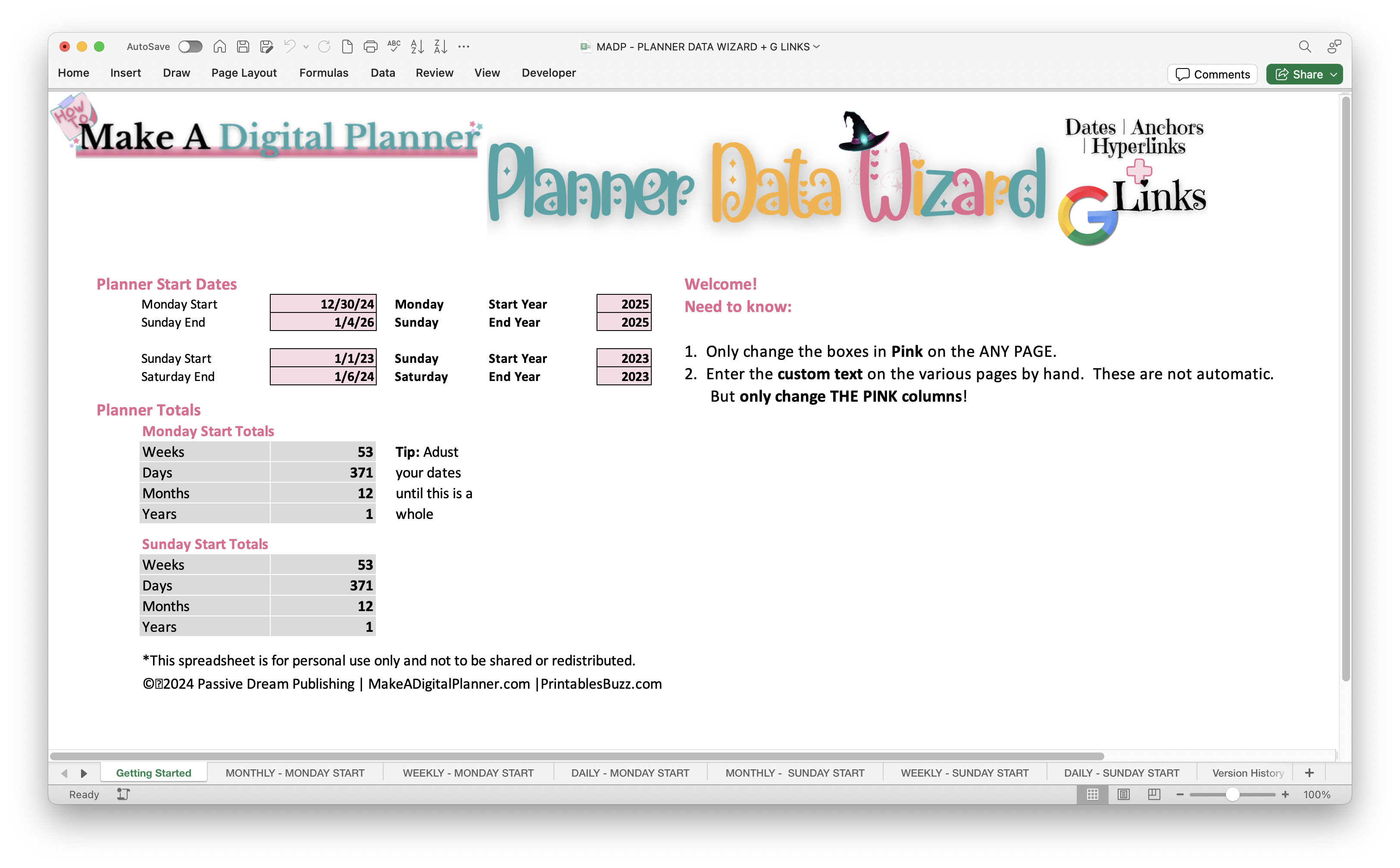 This is the data sheet you need to for data import that has hyperlinks in the planner & Google links, it includes:- Sunday & Monday Start